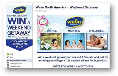 Wasa, the world’s leading producer of flatbreads, is having a Weekend Getaway sweepstakes happening right now, the tab is on their Facebook page – http://www.facebook.com/wasa?