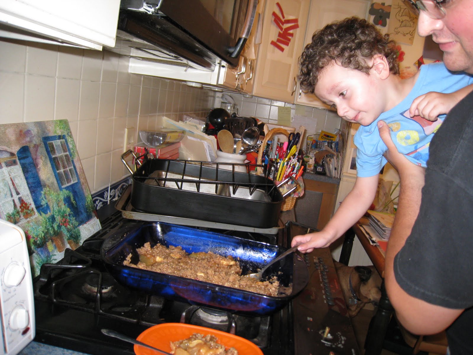 The Apple Crisp was SUPER EASY to make. All you needed was the Apple Crisp mix, butter, (mmmm, butter) and 6-8 fresh apples. You just mix the apples and butter together and sprinkle the Apple Crisp on top! Little Man helped- Kamikaze was at her friend’s house. That is how easy it was. And it was ready in just 25 minutes!